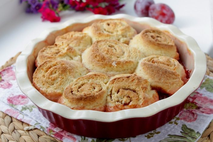 Скатать в рулет и острым ножом разрезать. Уложить спиральки из теста в форму на сливы.