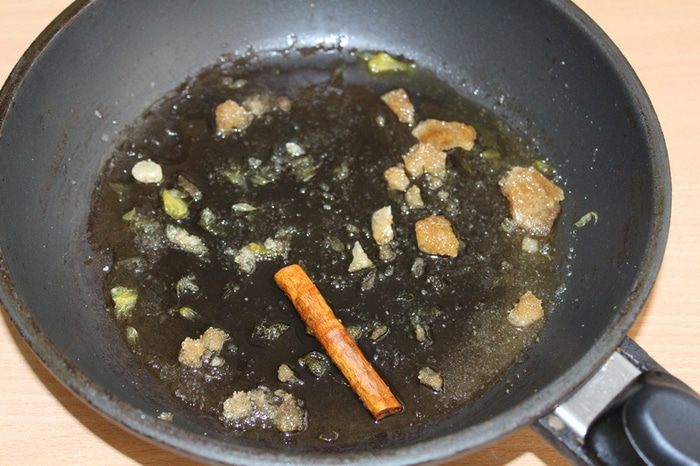 В сковороду выжать апельсиновый сок, добавить сахар и палочку корицы. Поставить на умеренный огонь.
