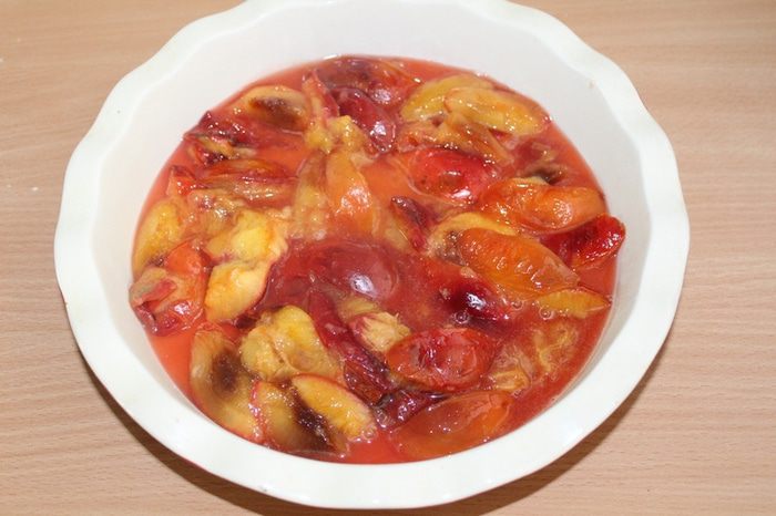 Когда растает сахар, добавить сливу. Подержать на огне 2 минуты, перевернуть, готовить еще 2-3 минуты, снять с огня и переложить в форму для выпечки.