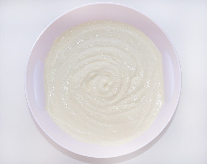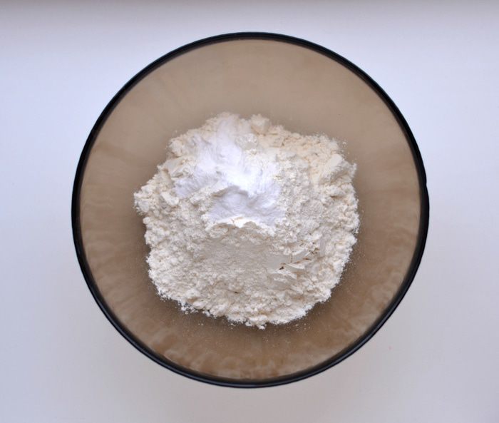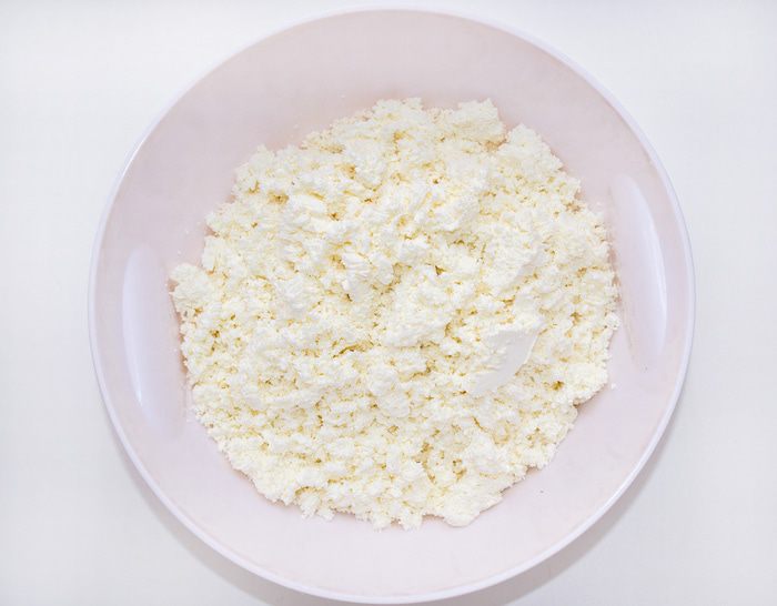 Добавить к творожно-яичной массе растительное масло и муку с разрыхлителем. Муку добавлять порционно, постоянно вымешивая лопаточкой. Тесто должно быть по консистенции как густая сметана.