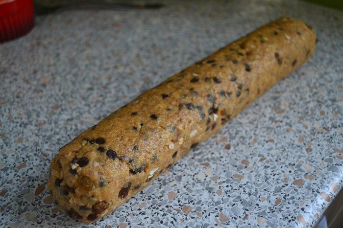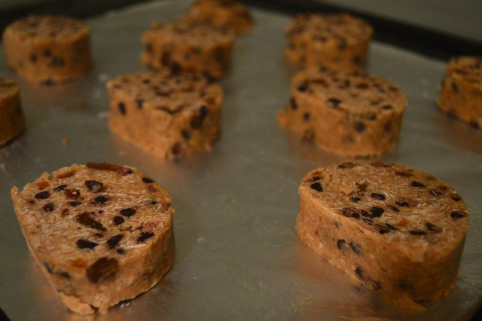 Разогреть духовку до 180С. Достаём тесто из морозилки и даём ему полежать 5 минут. Нарезаем на шайбочки толщиной 2 см. И выпекаем 15 минут.