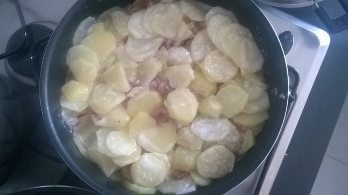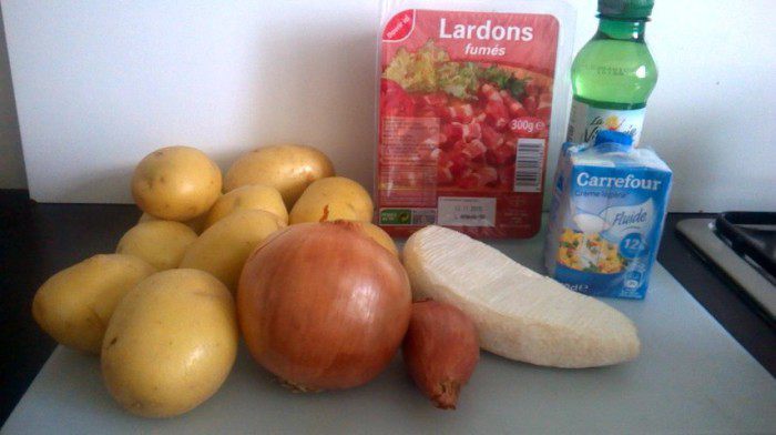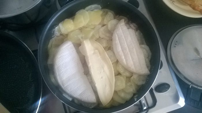 Сыр режем пластинками и выкладываем сверху. Поскольку сыр Реблошон очень сложно найти в России, берем любой сыр и трем на мелкой терке. Сыр Реблошон имеет кремообразную текстуру и образует корочку. Но я пробовала с Российским сыром, тоже очень вкусно. Главное долго не запекать, иначе сыр будет слишком твердым. Ставим все в духовку на 20-30 минут при температуре 180 градусов.