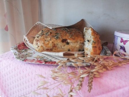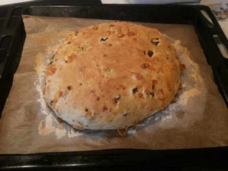 Добавляем в тесто крупно порезанные оливки, вяленые помидоры, зелень можно свежую, можно сушеную (мне больше нравится сушеный базилик) и нарезанный мелким кубиком сыр (какой вам больше нравится или какой на данный момент есть в холодильнике, у меня "Российский"). Все должно быть комнатной температуры! Аккуратно вмешиваем все это в тесто и кладем на бумагу для выпечки, присыпанную мукой, придавая будущему хлебу желаемую форму. Оставляем в теплом месте на 30 минут. И выпекаем в разогретой до 200-220 градусов духовке около 25 минут до румяного цвета.