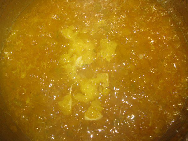 Вливаем сок из апельсинов с кусочками апельсина, кладем цедру, перемешиваем и варим до загустения.