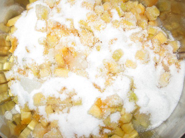 На дно кастрюли налить немного воды, выложить кусочки тыквы, засыпать сахаром, довести до кипения и постоянно помешивать. Варить 20-30 мину.