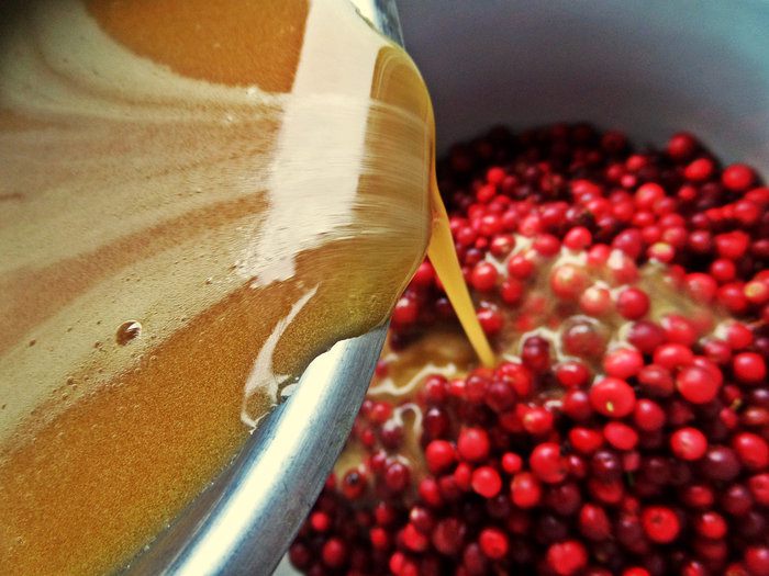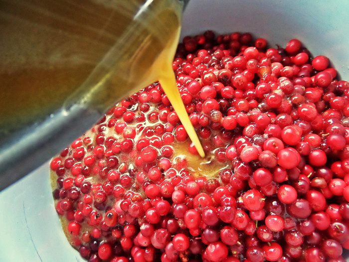 Выливаем мёд в отмеренные баночками и весами ягоды.