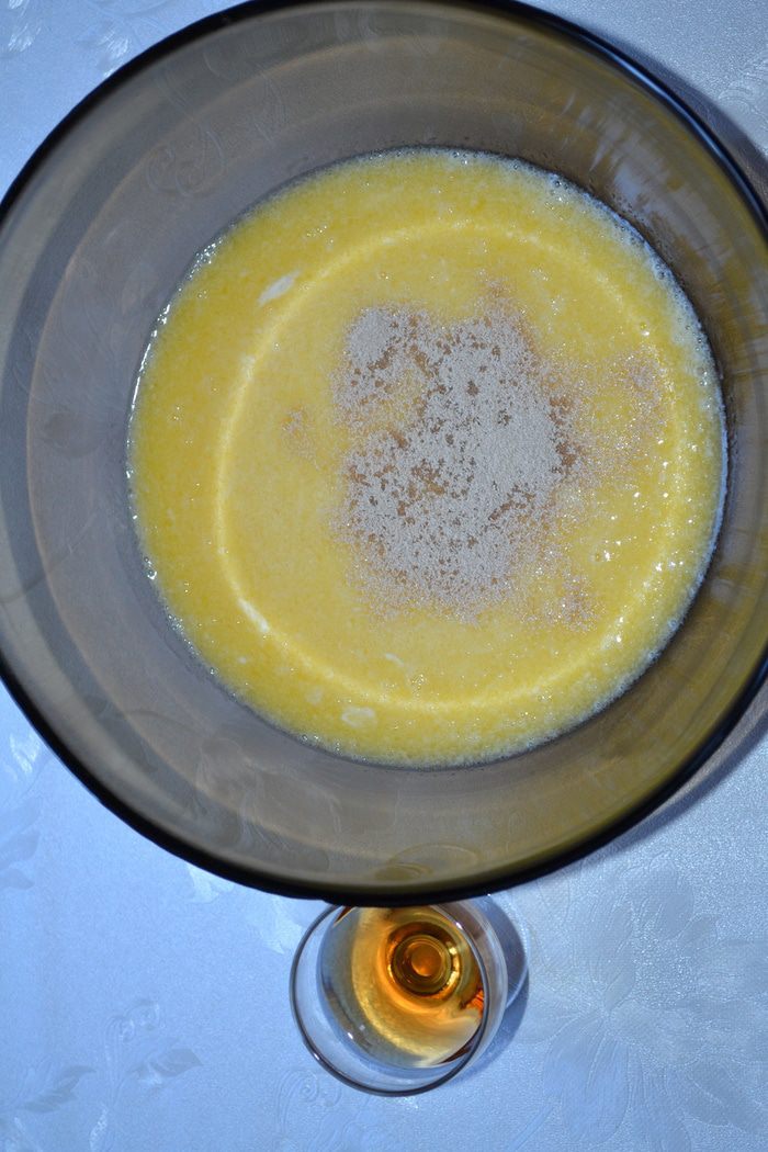 Добавить сухие дрожжи и коньяк. Коньяк добавлять по желанию. Спиртное придает тесту воздушность, мягкость. На вкусе никак не отражается.