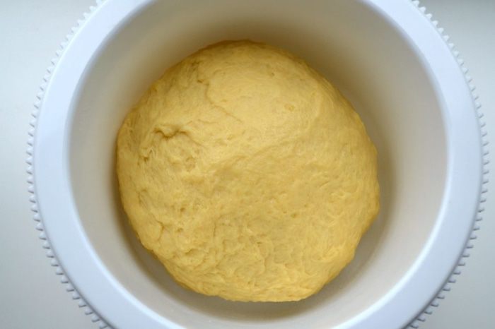 Замесить не очень крутое тесто. Поместить в емкость, накрыть пленкой и поставить в холодильник на 2 часа.