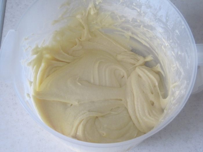 В миске взбить блендером 75 гр размягченного сливочного масла комнатной температуры с 75 гр сахара, просеянной мукой, разрыхлителем, молоком, ванилином, 1 яйцом и желтками еще от 2-х яиц.