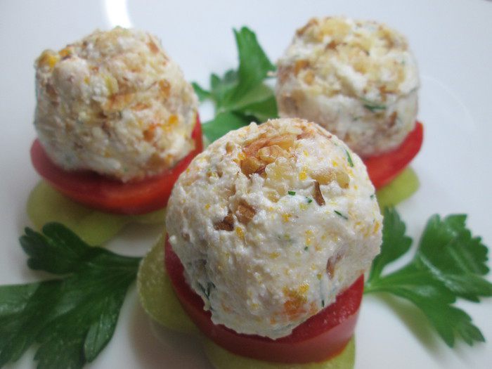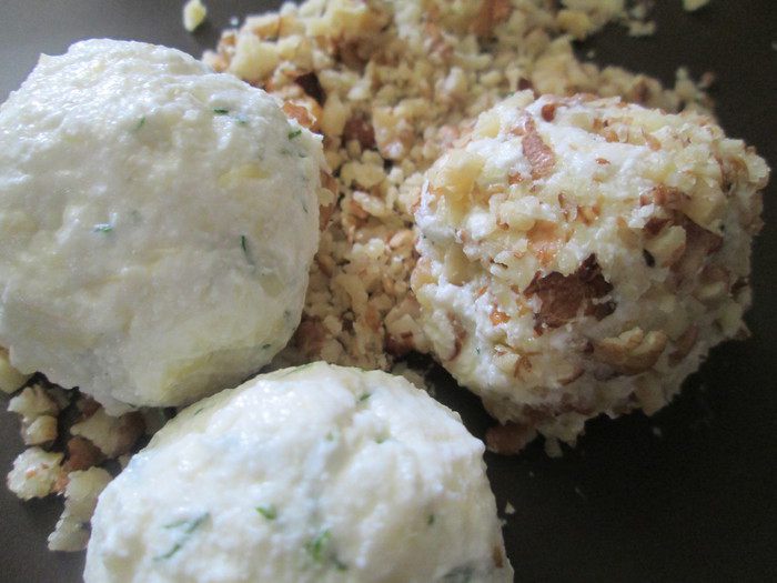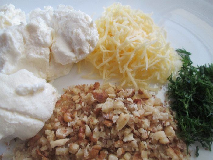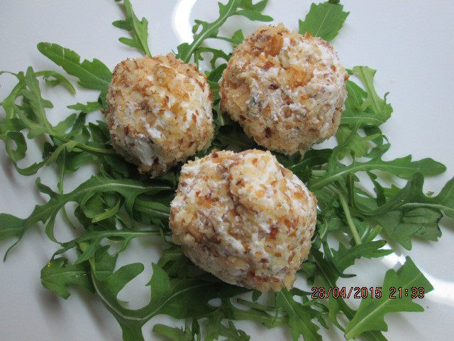 Смешиваем по 1\2 части каждого ингредиента: творога, сыр, зелени и лепим мокрыми руками шарики, можно добавить чуточку измельченного чеснока. Обваливаем их в ореховой крошке.