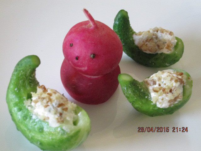 Взрослым наполняем шарики чесноком и подаем с руколой или листиками салата - закуска на все времена!