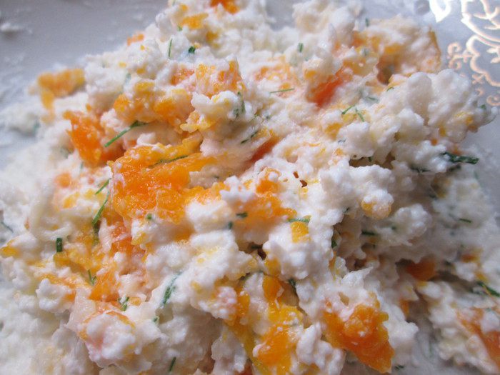Я смешала вторую часть творожной массы с капустой и морковью вместе. Тщательно размешала (овощи можно сначала взбить блендером).