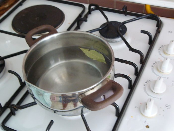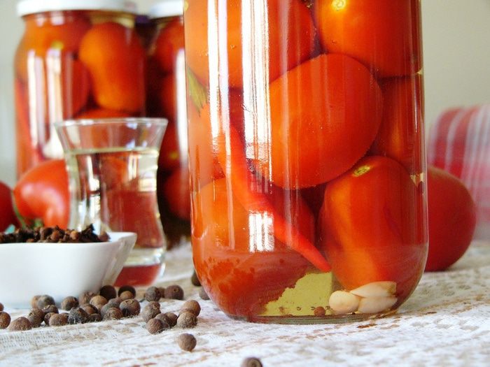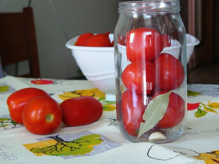 В каждую банку положить лавровый лист, гвоздику, черный и душистый перец горошком, 2 зубчика чеснока. Очень сильный аромат дает укроп, так что, если есть, добавьте его тоже. Плотно уложить в банки помидоры, добавив по 1 стручку острого перца.