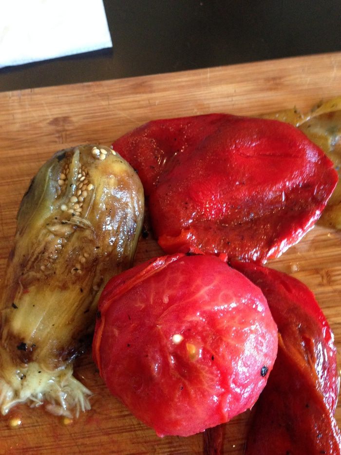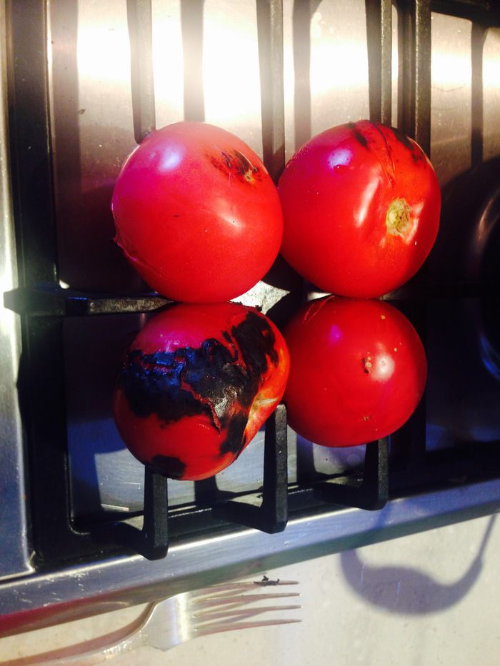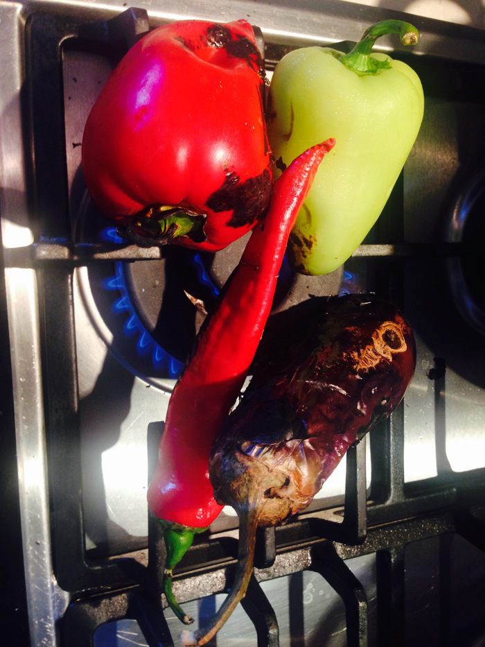 Остальные овощи можно поставить либо на соседнюю конфорку, либо дождаться пока предыдущие обуглятся снаружи по всей площади и поставить на их место. Овощи нужно время от времени переворачивать для равномерного пропекания.