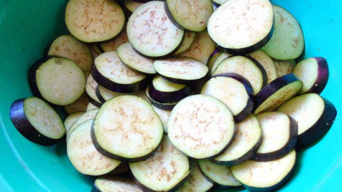 Баклажаны помыть, нарезать кружочками, хорошо посолить и оставить на 2-3 часа.