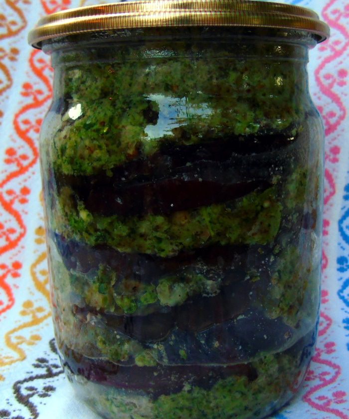 Уложите в баночки слоями баклажаны и заправку. Закройте крышками, поставьте в посуду с водой и застеленным дном, и на огонь стерилизоваться на 30 минут с момента закипания воды. Закатайте и переверните вверх дном! Вкусной вам зимы!