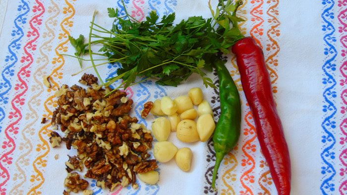 Чеснок, перец, петрушку и орехи пропустить через мясорубку. Добавить соль, растительное масло и уксус. Хорошо перемешать.