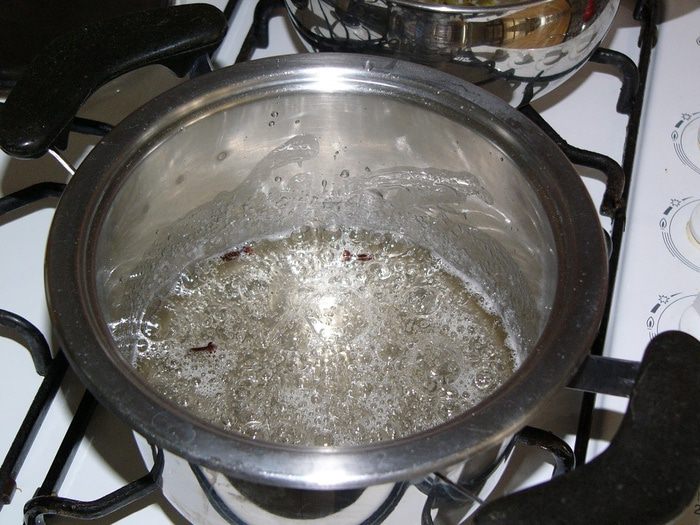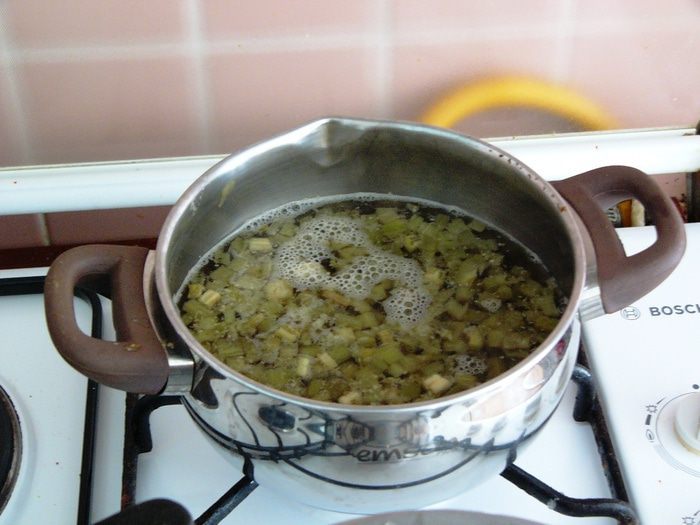 В другую кастрюлю влить 0,5 стакана воды, добавить сахар, закипятить и варить, помешивая, 10 минут.