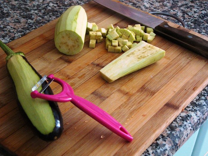 Два небольших баклажана очистить от кожицы и нарезать мелкими кубиками.