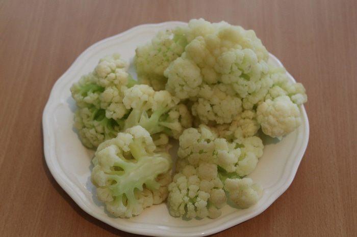 Цветную капусту разобрать на соцветия и отварить в подсоленной воде 3-4 минуты.