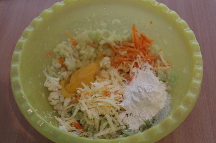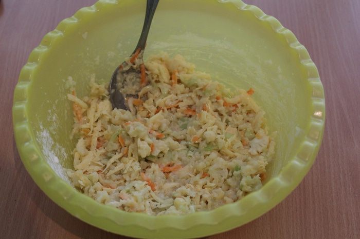 С помощью погружного блендера (или просто ножом) измельчить капусту, добавить натертую морковь, яйца, сыр, муку, слегка посолить.