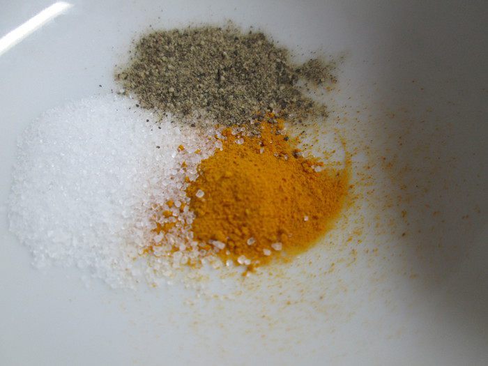 Смешать на тарелке соль, перец и куркуму.