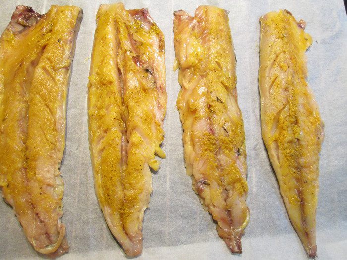 Этот рецепт очень простой и быстрый. А использование куркумы позволяет сделать ее "золотой рыбкой". К тому же куркума вместе с перцем частично убирает специфичиский запах рыбы.