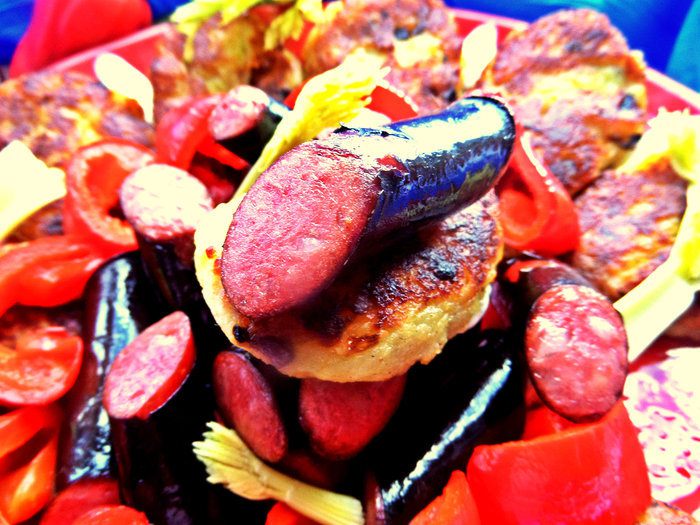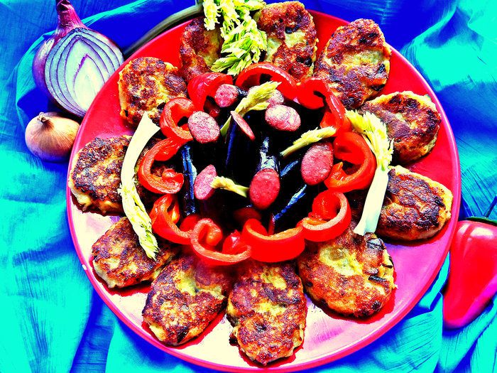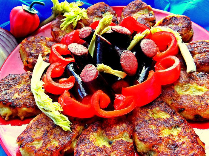 Кладём на большое блюдо золотистые оладьи. В центр высыпаем колбаски и украшаем перчиком и зеленью.
