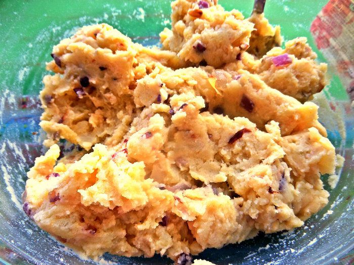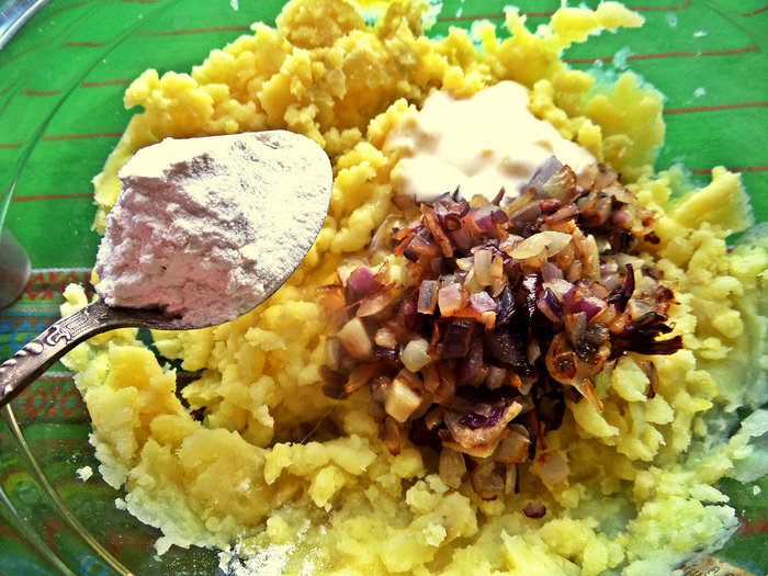Высыпаем туда обжаренный лук, белок, по ложке сметаны (или майонеза), муки добавим.
