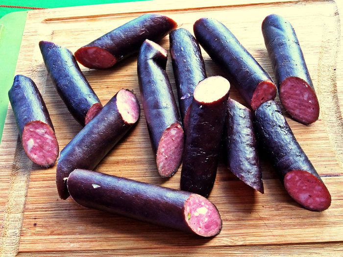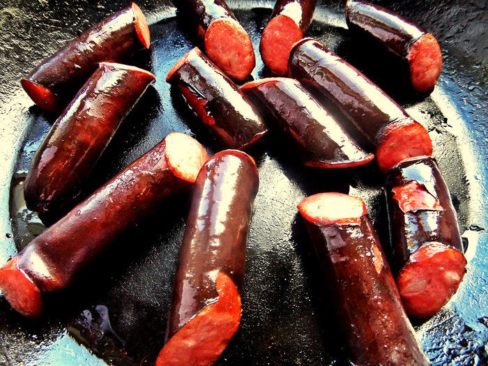 Длинные колбаски, подкопчённые "с дымком", делим для удобства каждую на 4 части.