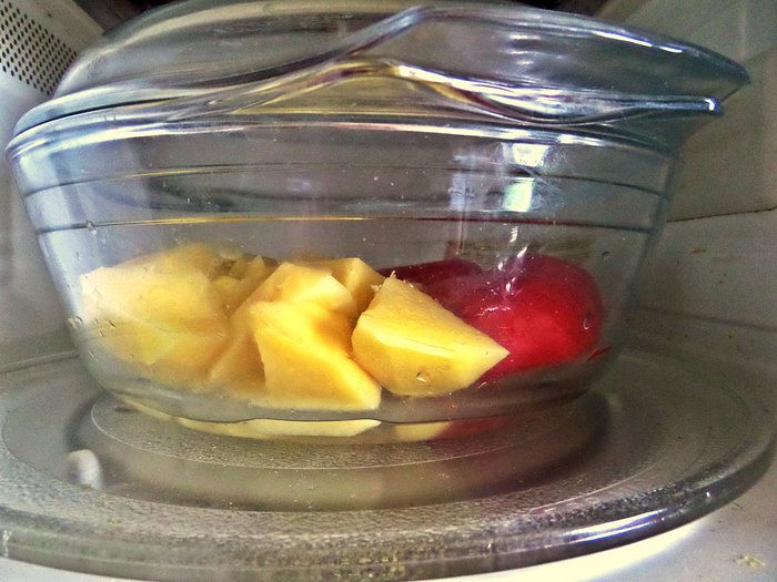 Закрываем стеклянной крышкой и помещаем в печь на 3 минуты при 750W.