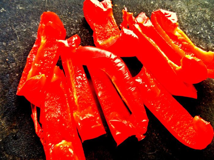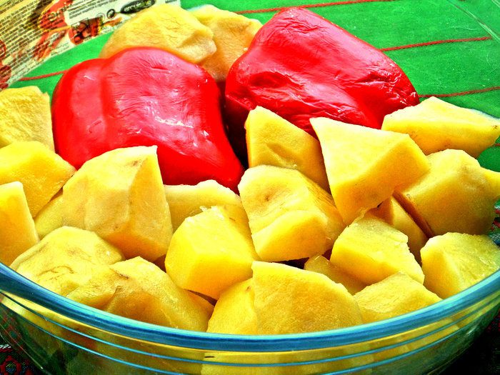 Через 3 минуты вынимаем перец, а картофель запекаем ещё 7 минут, всего 10 минут печётся картошечка.