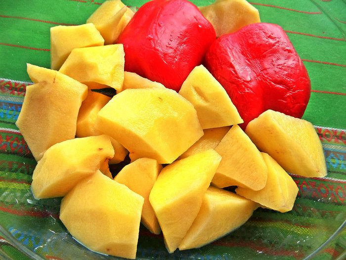 Овощи решила запечь в СВЧ. Для этого чистим, делим крупно на кусочки и помещаем в посуду для СВЧ.