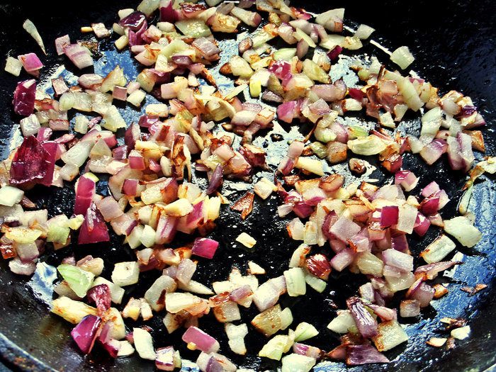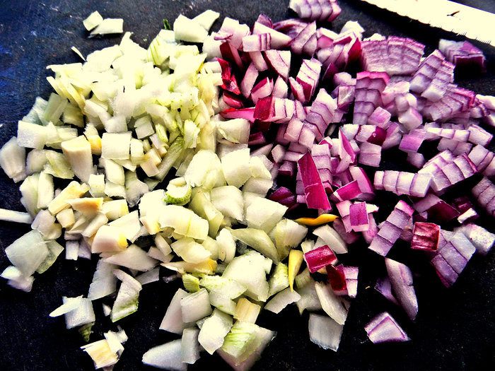 Пока ждём картошечку, нарежем лук мелко (брала два вида лука, но это не обязательно!).