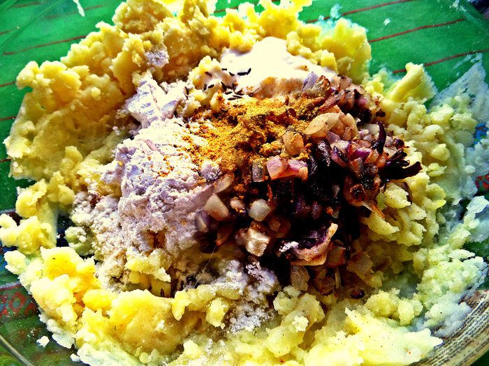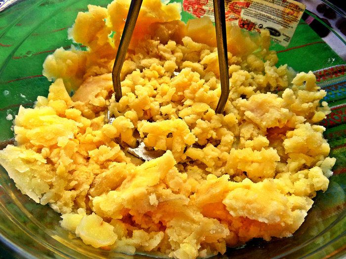 Теперь вернёмся к картошке. В той же посуде, где и запекалась, разомнём толкушкой.