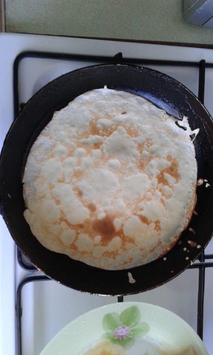 На раскаленной сковороде выпекаем блинчики, смазываем их растительным маслом.
