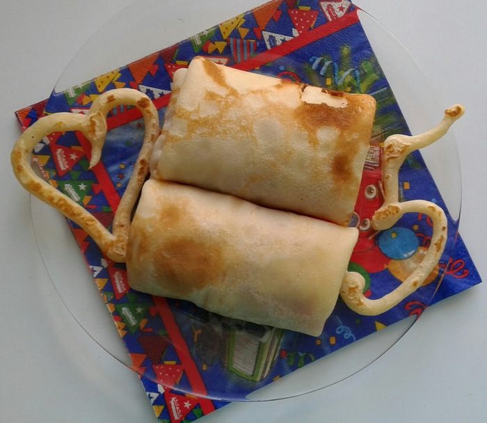 Все дети любят блины, а тем более сладкие! Своему ребенку на завтрак я часто готовлю блинчики с вареньем (в данном случае с грушевым), а, оформив блины такими фигурками, вы можете лишний раз сказать своему чаду о том, как вы его любите и желаете только пятерок!