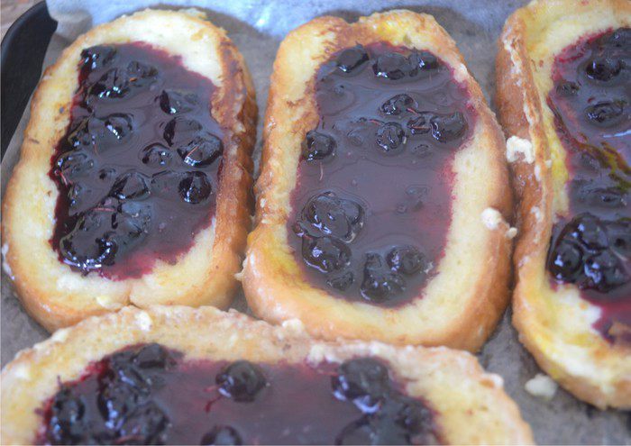 Поджаренные гренки выложить на противень, застеленный промасленной бумагой для выпечки. На каждую гренку положить по 1 ст. ложке черничного джема. Можно джем заменить на свежие ягоды или нарезанные фрукты, это как Вам ваша фантазия подскажет.