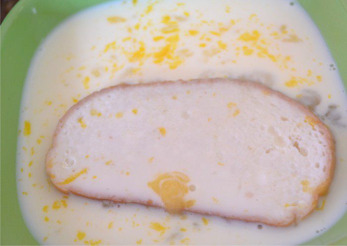Булку разрезать на равные кусочки, толщиной 1,5 см. Кусочки замочить в смеси молока и яиц. Они должны хорошо пропитаться, но не разваливаться.