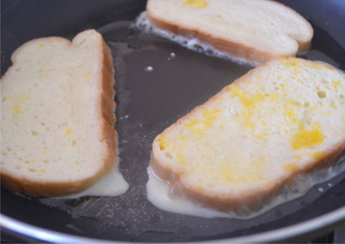 Булку выложить на разогретую сковороду и обжарить до красивой золотистой корочки.