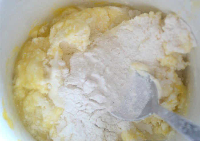 Творожно-яичной массе добавить просеянную муку и разрыхлитель.