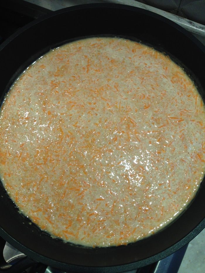 Разогреть сковороду с тефлоновым покрытием и влить туда морковное тесто. Выпекать на медленном огне под крышкой минут 7-10. Низ блина должен порозоветь. Следите, чтобы блин не подгорел!