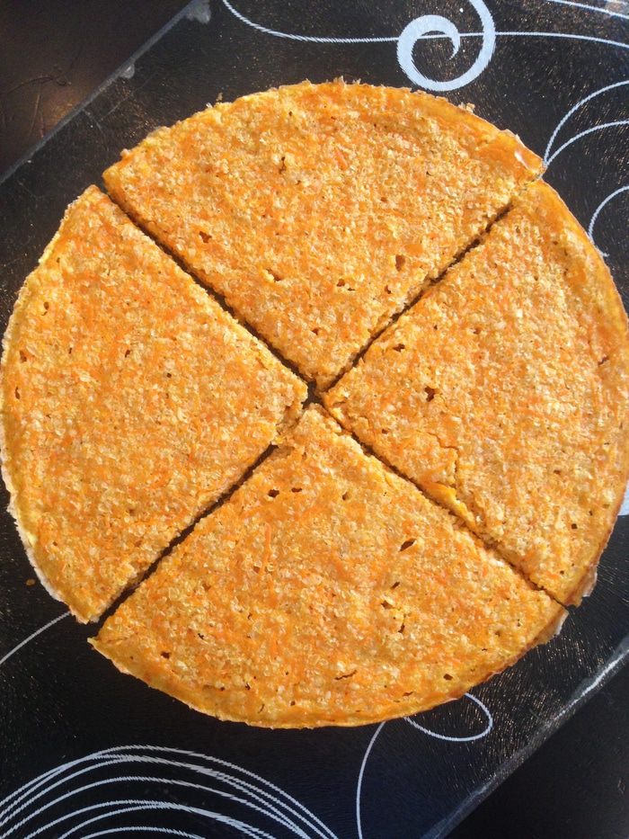 Этот тортик на выходе получается как один большой кусок! Если хотите сделать его на большое количество людей, тогда выпекайте 3-4 морковных блина и не разрезайте их, а соберите как обычный многослойный торт, промазав все слои. Количество ингредиентов в рецепте указано на 1 блин и одну порцию крема.