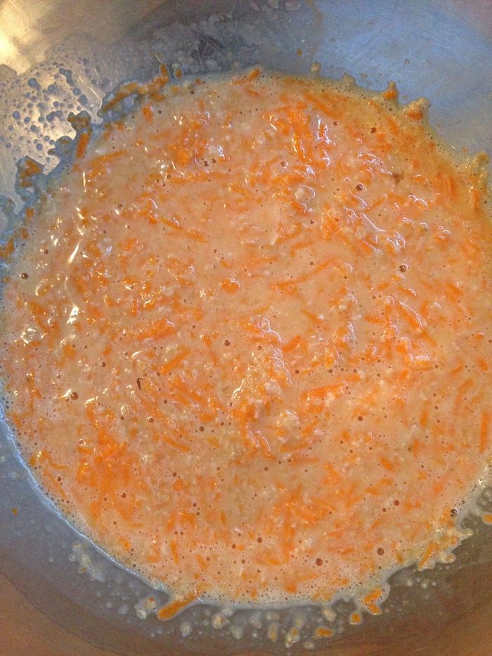 Натереть морковь на мелкой терке (если морковь мелкая, то можно целиком).