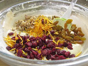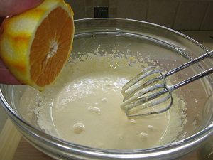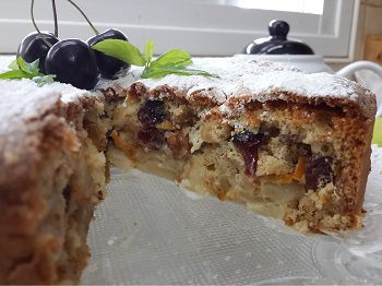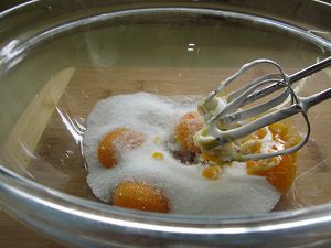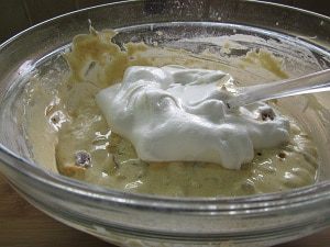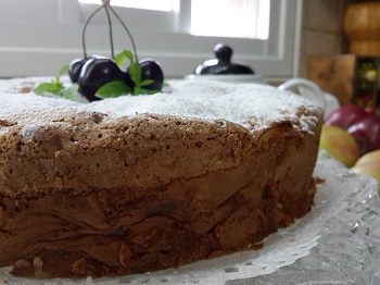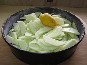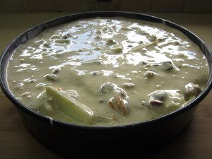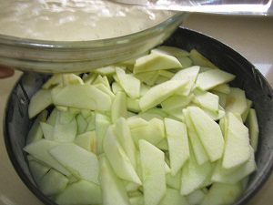 Готовое тесто выливаем сверху на подготовленные яблоки. Вот здесь вопрос, наверное, спорный! Можно, конечно, яблоки тоже вмешать в тесто, чтобы они встречались там равномерно, но... Очень нравиться мне, когда пирог в конце получается как бы слоистым. Внизу слой яблок с тестом, а сверху как бы второй пирог с очень продуманными и подходящими к яблокам вкусами.