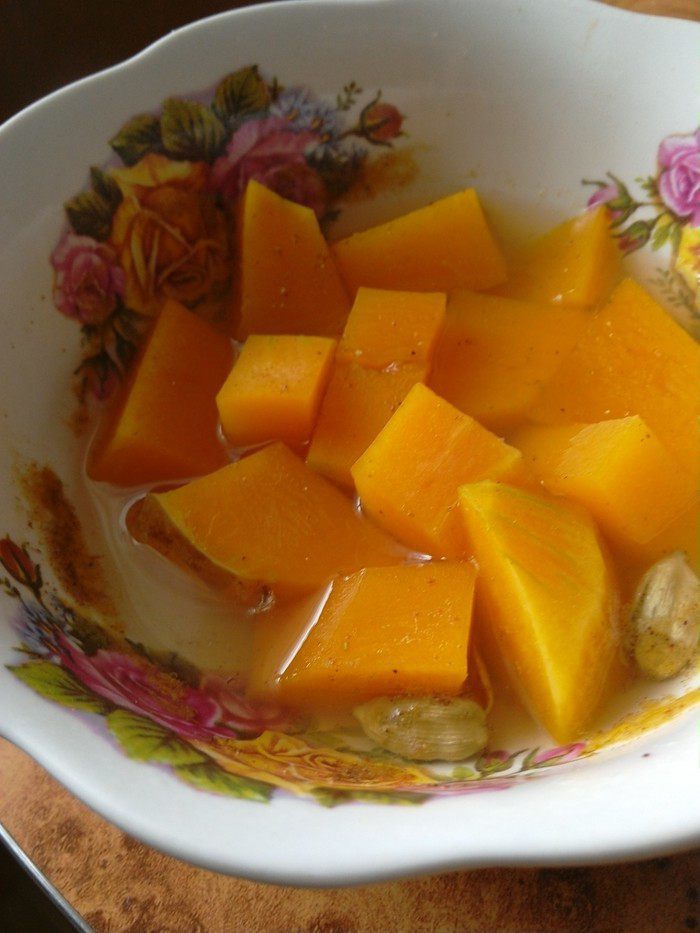 Тыкву очищаем и режем на кусочки. Мне на базаре досталась мускатная тыква, которая сама по себе очень сладкая и ароматная, так что она не требует много приправ. Если ваша тыква не очень запашистая, можно добавить ещё и бутончик гвоздики и пару горошин душистого перца. У меня просто щепотка корицы (за неимением палочки) и раздавленные стручки кардамона. Заливаем водой и отправляем на 3 минутки в микроволновку, тыква станет мягкой.