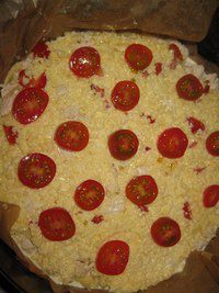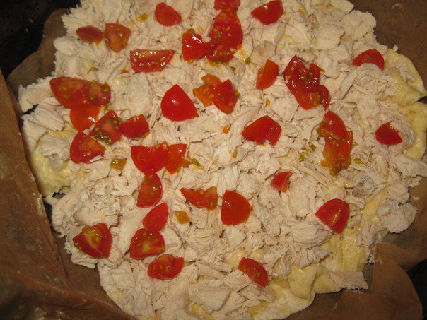 Выложить начинку: курицу, лук и порезанные помидоры черри. Штук 8-10 черри оставить для украшения.