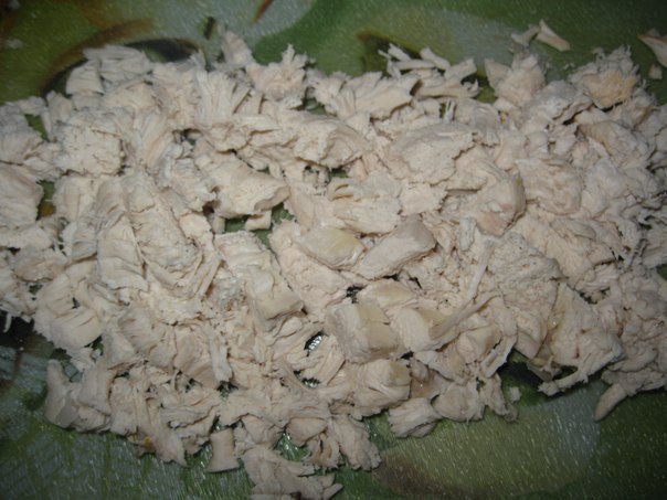 Для начинки отварить филе курицы и порезать. Лук мелко порезать и поджарить на растительном масле 3-4 минуты.
