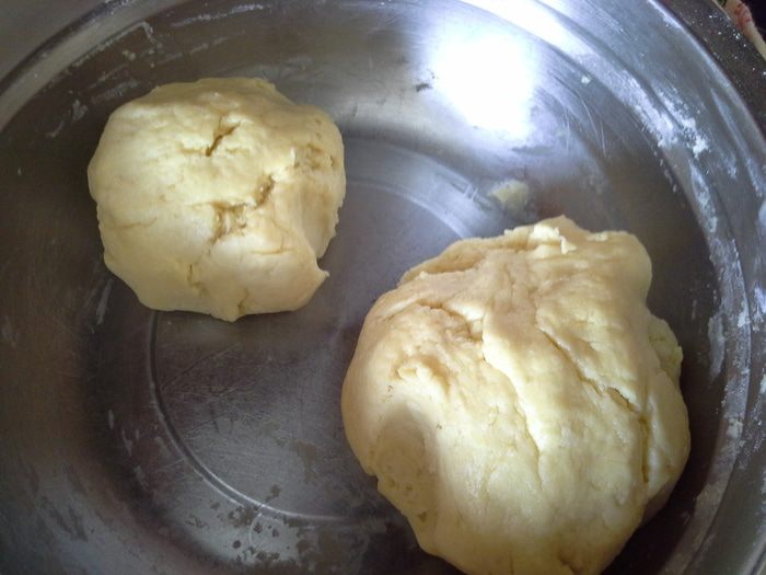 Замешать тесто, оно должно слепиться в комок и получится мягким (муку написала примерно, если что, добавляйте по 1 ст. л.), разделить на две части.