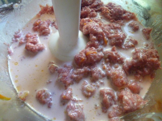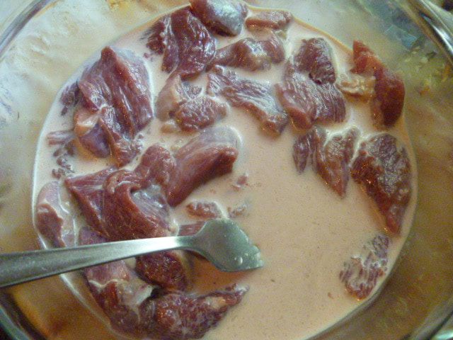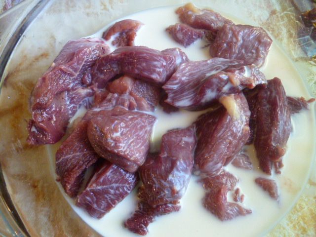 Затем мясо отделяю от жира, режу на небольшие кусочки и заливаю молоком на 1 час.